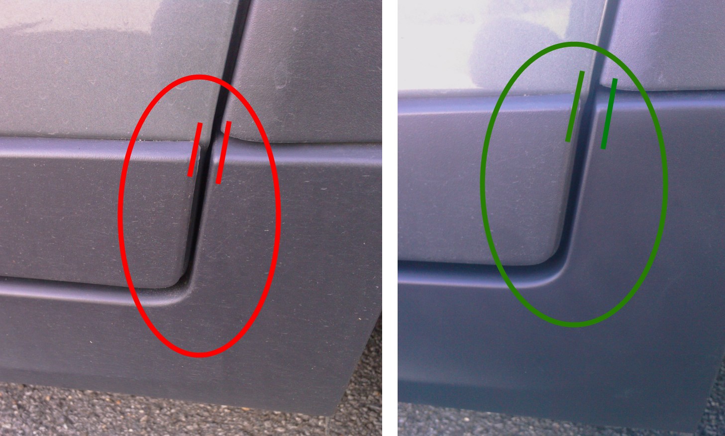 edit: doplnění fotky - nevím, jestli to na tom nezúčastnění dobře uvidí, ale mezi obrázkem vlevo a vpravo je rozdíl nejenom v šířce spáry, ale všimnout si můžete i toho, jak prahová lišta teď pěkně navazuje na lem blatníku (obrázek v pravo), původně tam byl "zoubek"...