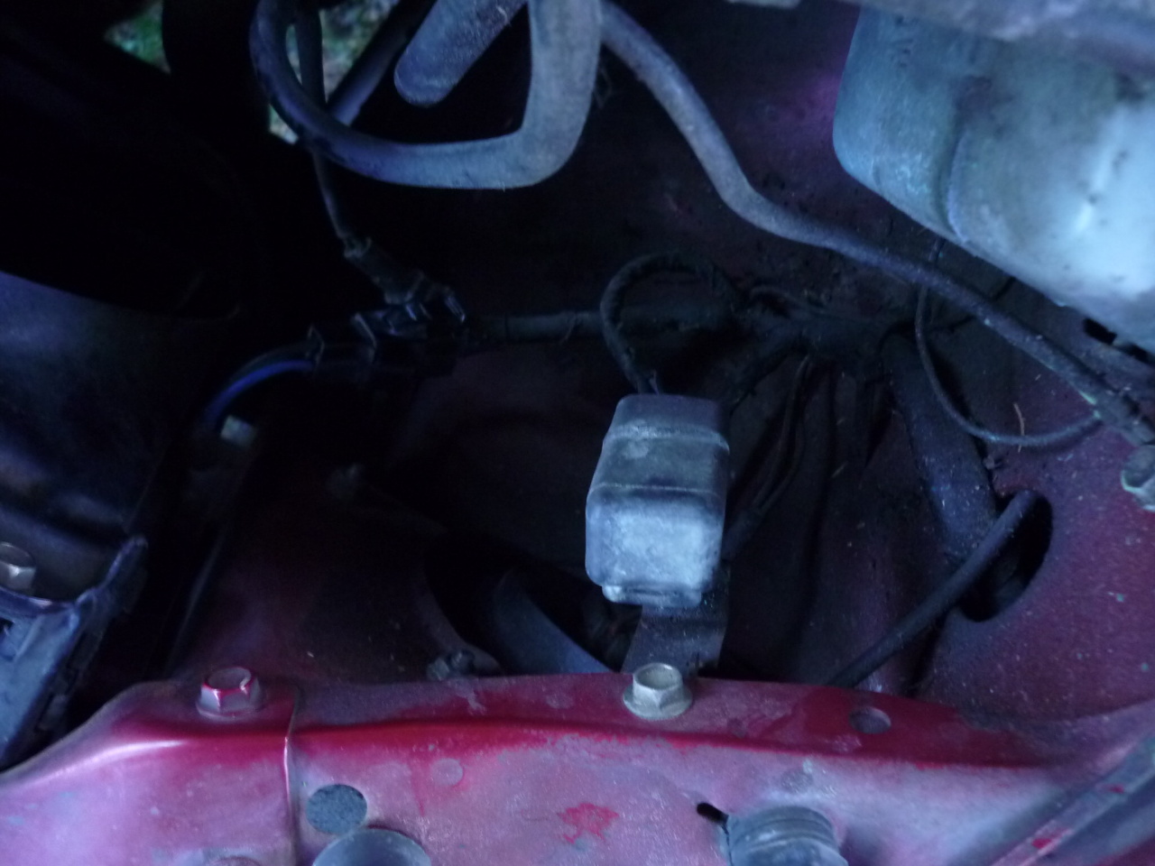 Na saharu za chladičem ja napojený relátko. Na relátku je gumový držák, který je nasunutý na plech na karoserii.
