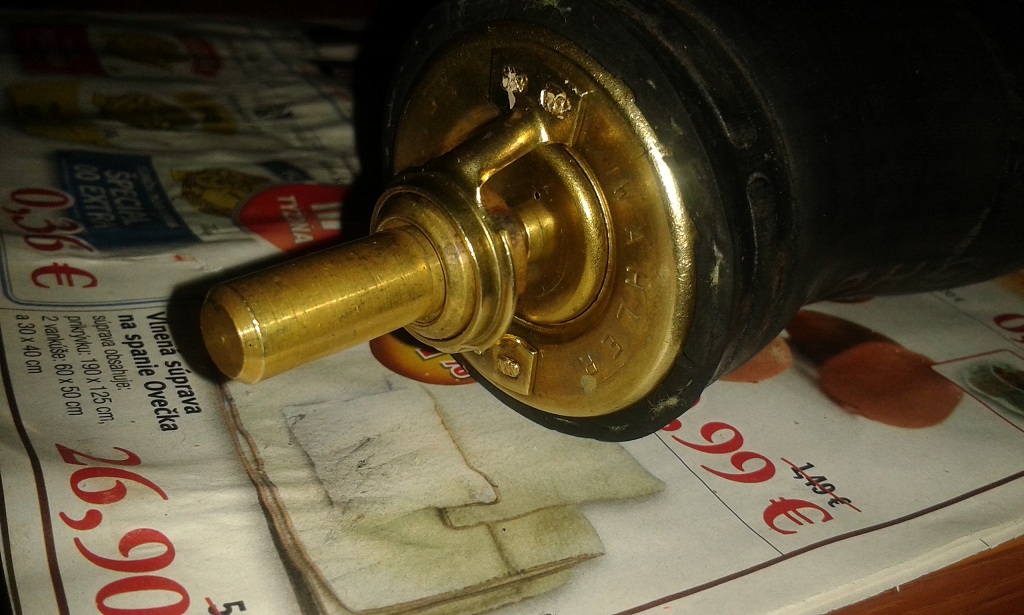 Termostat ktory som vybral z motora bol tusim este original , vyzeral byt dost kvalitny a ked som sa pozrel nan proti slnku ziadne presvitanie , dokonale tesny . Tie novsie uz tak presne nesedia a netesnia . Na tomto originalnom bolo tiez vyrazene ze je 87 stupnovy . Kedze som to mal vsetko rozobrate , tak som tam hodil ten novy a poskladal vsetko spet . Neskor ten original pri testovani vo vode otvaral spravne , ale uz trochu horsie zatvaral a zasekaval sa , zatvaral tak trhane . Asi mal za tych 15 rokov dost. A tu este foto so starym a s novym termostatom . Je to o nieco lepsie a takto to asi ma byt , lebo keby stala rucicka v strede , vlastne by stale bezal ventilator .