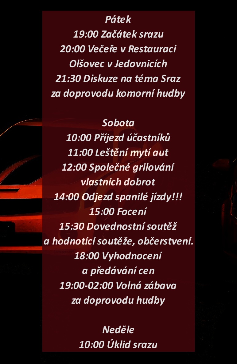 Pokud by někdo chtěl dojet ještě v pátek večer a zúčastnit se i zahájení srazu se společnou večeří budeme rádi. Jinak večeře bude kolem 20:00 hodin přímo na náměstí v Jedovnicích restaurace Olšovec, tak kdyby to náhodou časově někdo nestíhal, tak dojeďte přímo tam, kde nás určitě najdete :lol: Popřípadě, kdo nechce zajít na večeři, tak počká v kempu Olšovec kam po večeři všichni přijedeme a přesuneme se na Pizzerii, kde bude pokračovat zábava a hodování do pozdních hodin. -i :mrgreen: