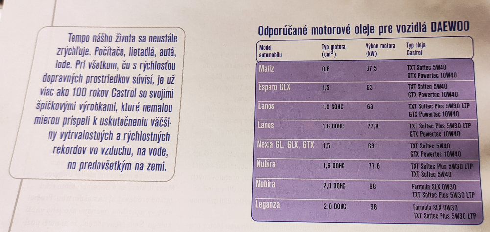 5w40 / 5w30 síce Daewoo predpisovalo do svojich motorov, ale keď už má motor za sebou nejaké km (200t+) tak je 10w40 proste lepší. 15w40 je zbytočný.