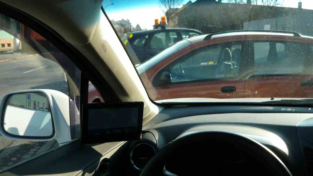 Umístění na přístrojovce jsem volil proto, že pozice v zorném poli čelního skla není vhodná, protože pohled na displej je na pozadí velkého jasu. (monitor si také nedáváme přímo proti oknu). Není to pohodlné pro oko a vesměs je to i daleko od řidiče.