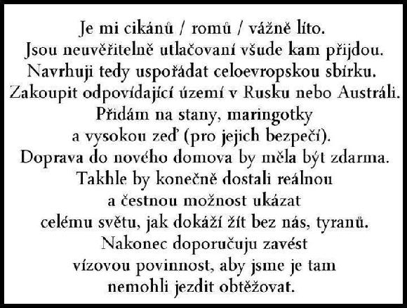 Se obávám, že v tomhle okamžiku už je jediným řešením cikánského problému pár bitevních vrtulníků a četa bigošů polních, patřičně vyzbrojená.